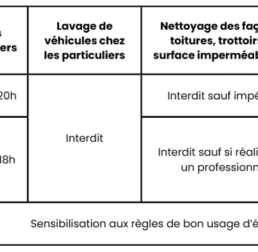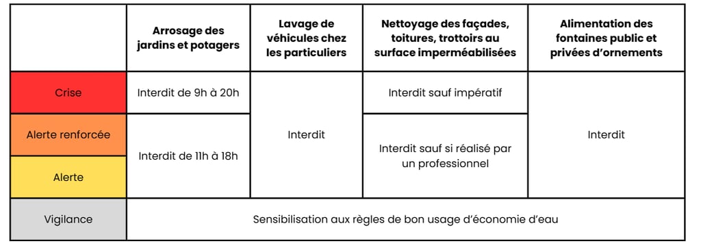 Ces restrictions concernent l'usage des eaux potables, souterraines et superficiels mais non les eaux grises recyclées. L'eau récupéré par TriPhon n'est pas considéré comme un nouveau prélèvement et peut donc être utilisées pour des usages restreints par un arrêté.