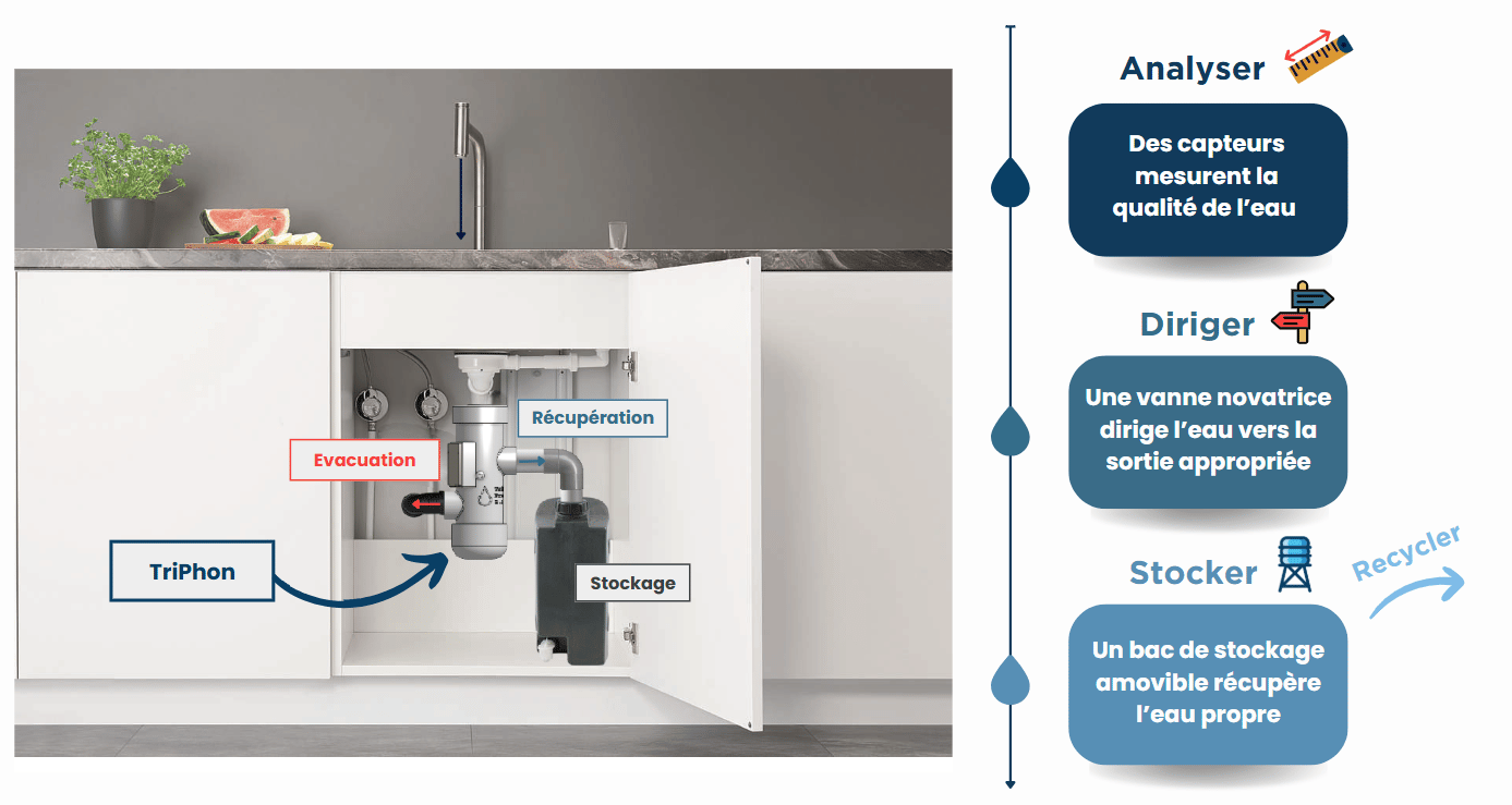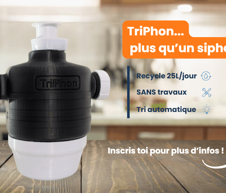 TriPhon est le premier siphon intelligent capable de trier l’eau à la sortie d’un évier. Le concept est simple, une fois sa qualité mesurée, l’eau est dirigée vers une sortie de récupération si elle est jugée propre ; sinon, elle est évacuée normalement. Une révolution qui vous permet de faire des économies d’eau bénéfiques tant financièrement que pour la préservation de la ressource.